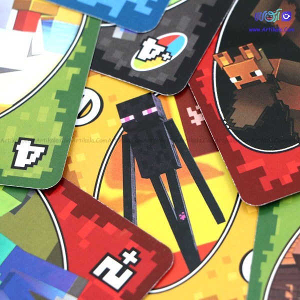 * **محتویات جعبه:** شامل 112 کارت بازی با تصاویر شخصیتها و نمادهای ماینکرافت و دفترچه راهنما.
